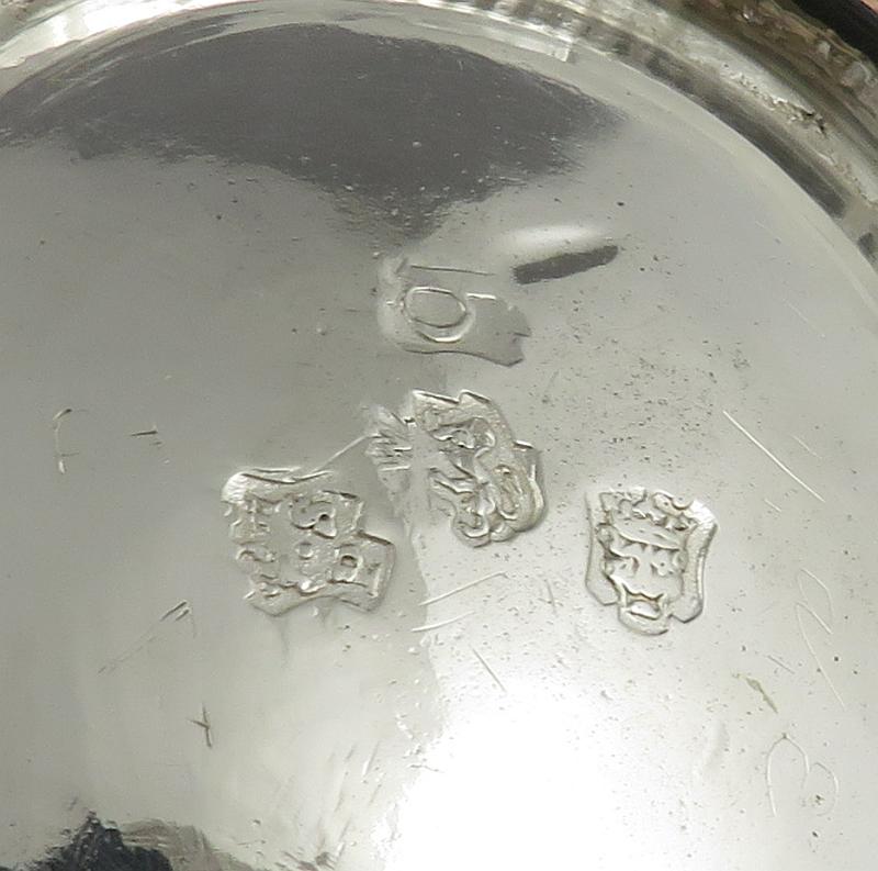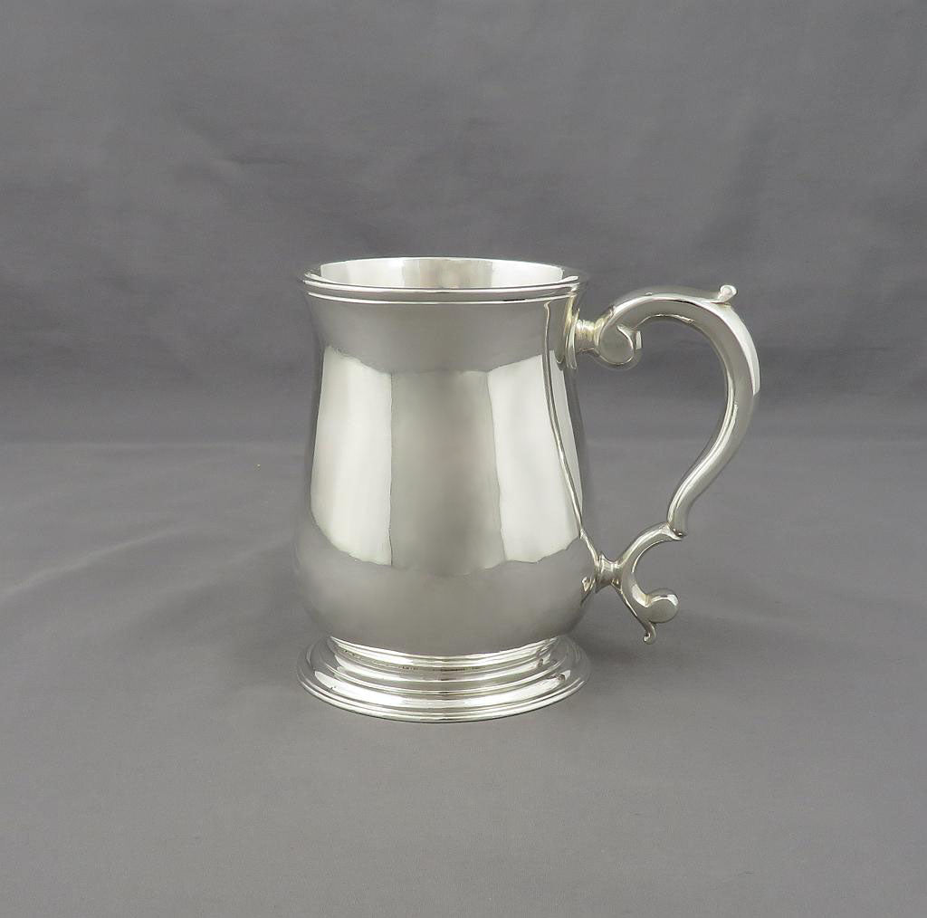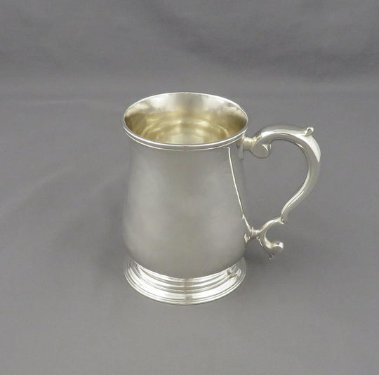 A George II sterling silver half-pint mug by William Shaw & William Priest (over-struck), hallmarked London 1751. Baluster shaped on spreading foot with scroll handle. Half pint size, 3.5" (9cm) high, 6 troy oz (186g).