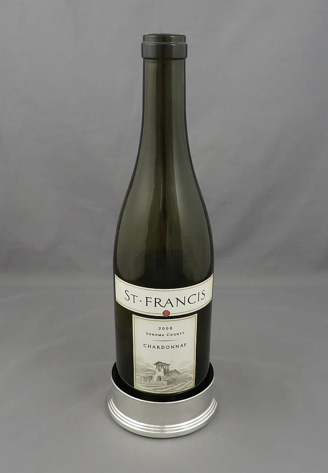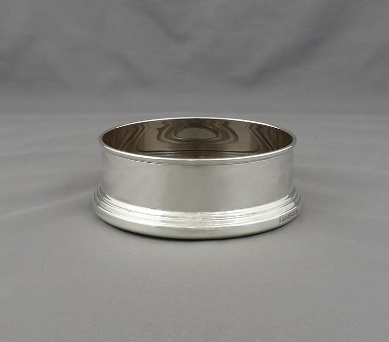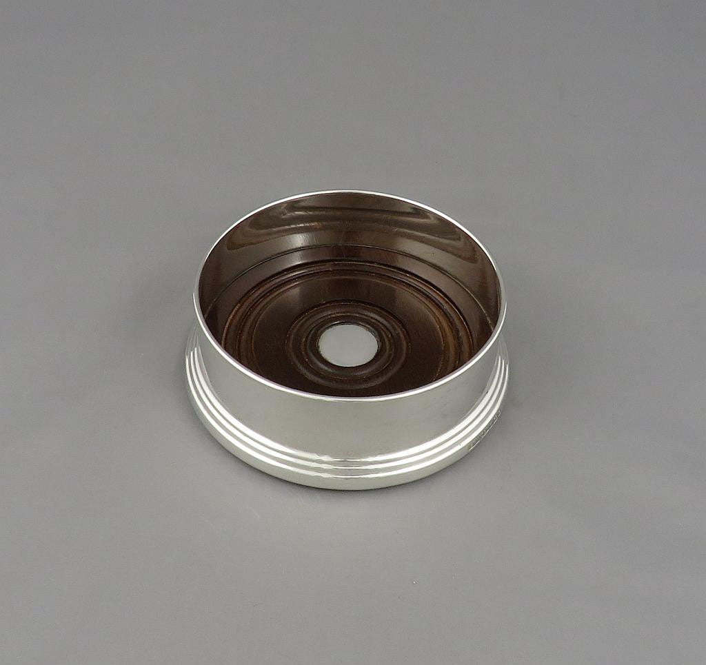 An English sterling silver wine bottle coaster by Laurence R Watson & Co, hallmarked Birmingham 2009. Convex sides with thread border, turned mahogany base and silver button. 3.6" (9.1cm) diameter.