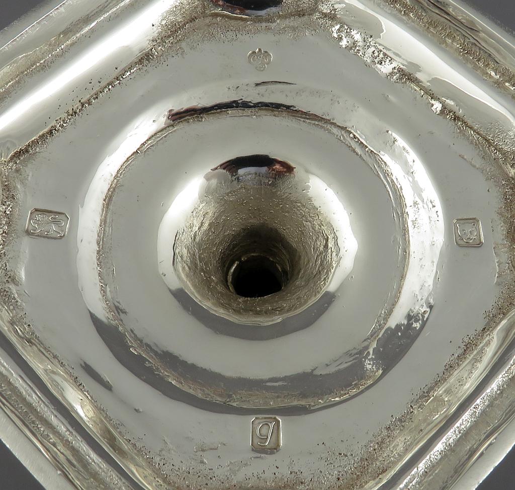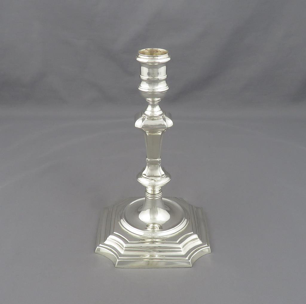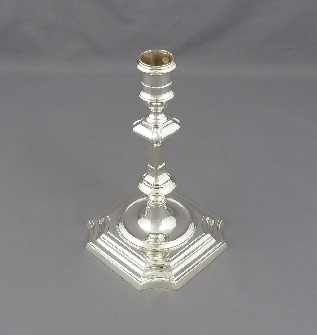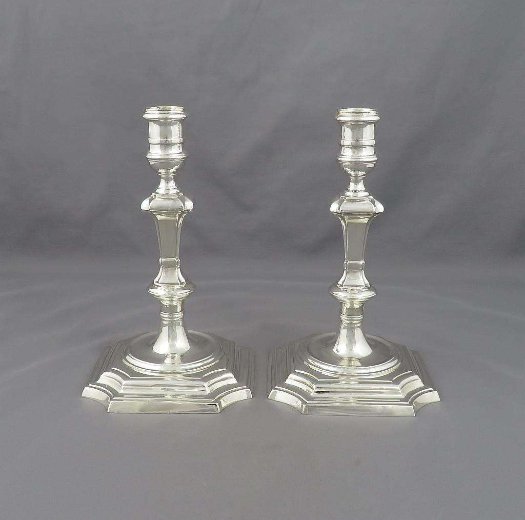 A pair of cast English sterling silver candlesticks by C J Vander Ltd, hallmarked London 1962. George II style, each on stepped square base with cut corners, and a double knopped stem. 6.25" (15.7cm) high, 3.9" (10cm) across the base, 20.4 troy oz (633g).