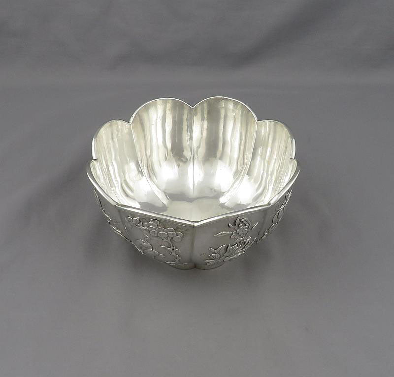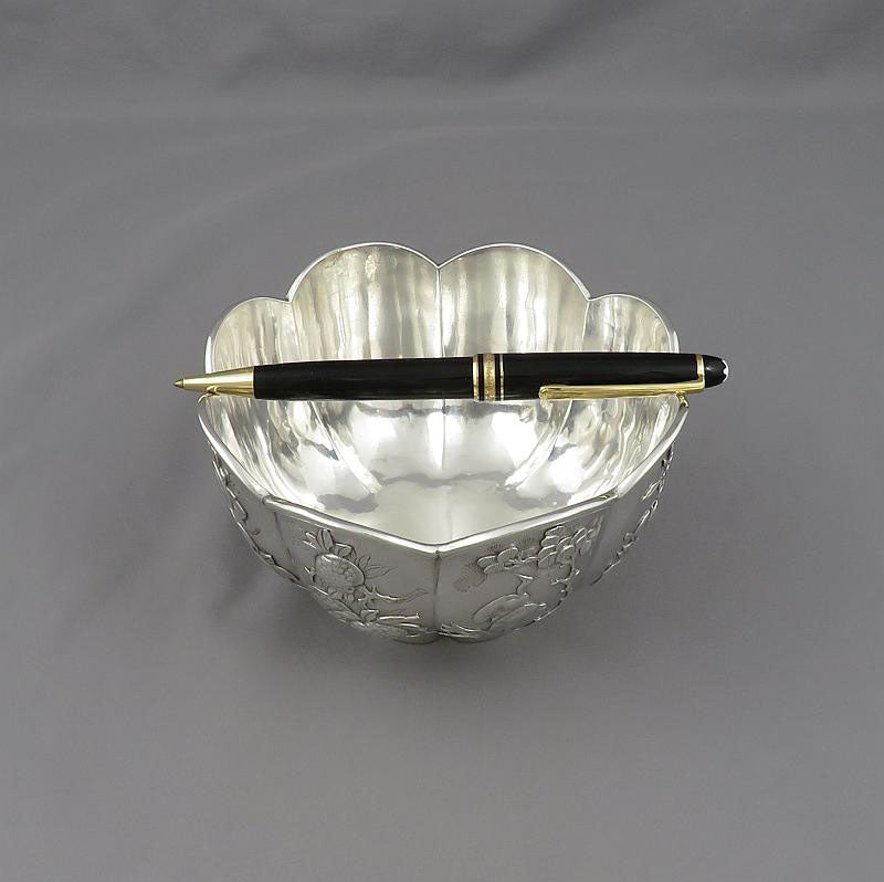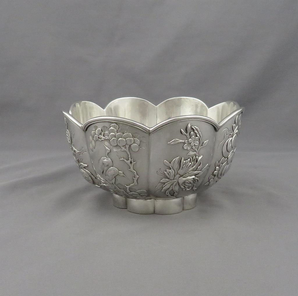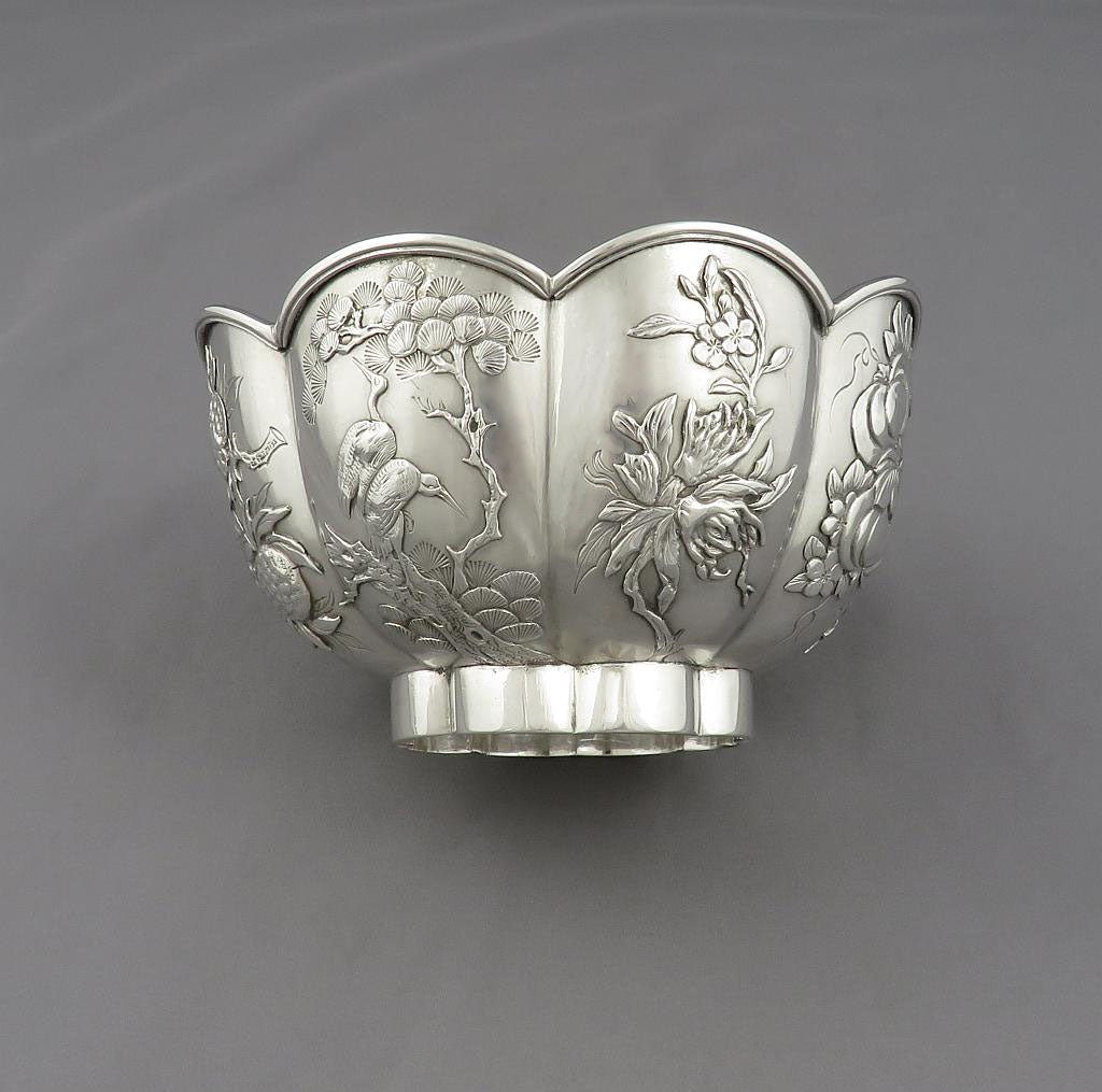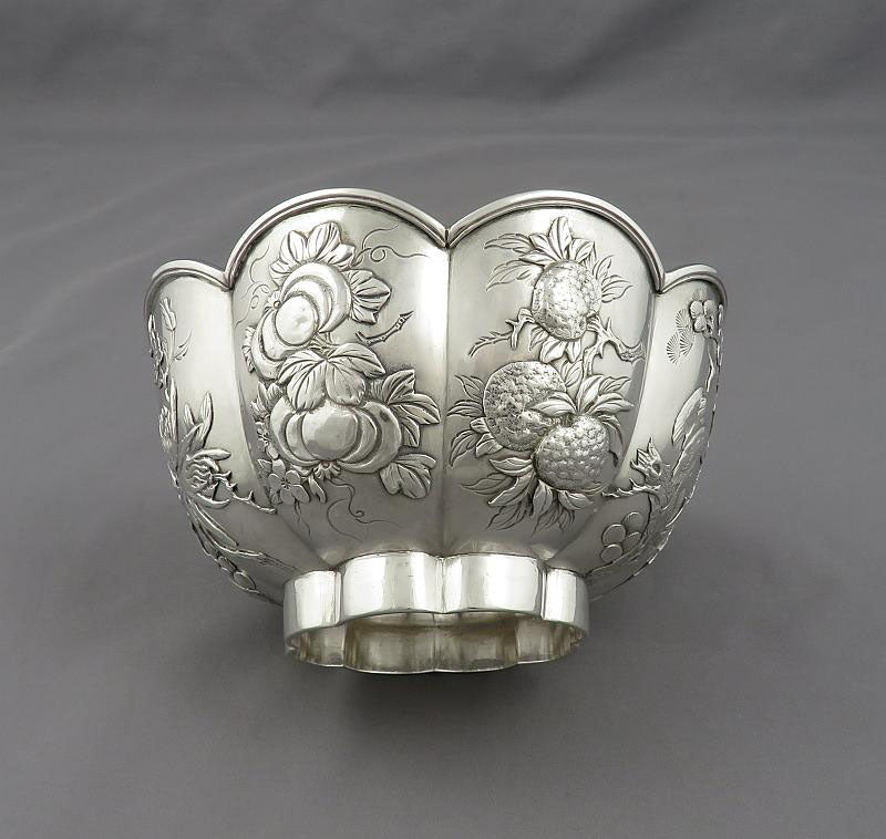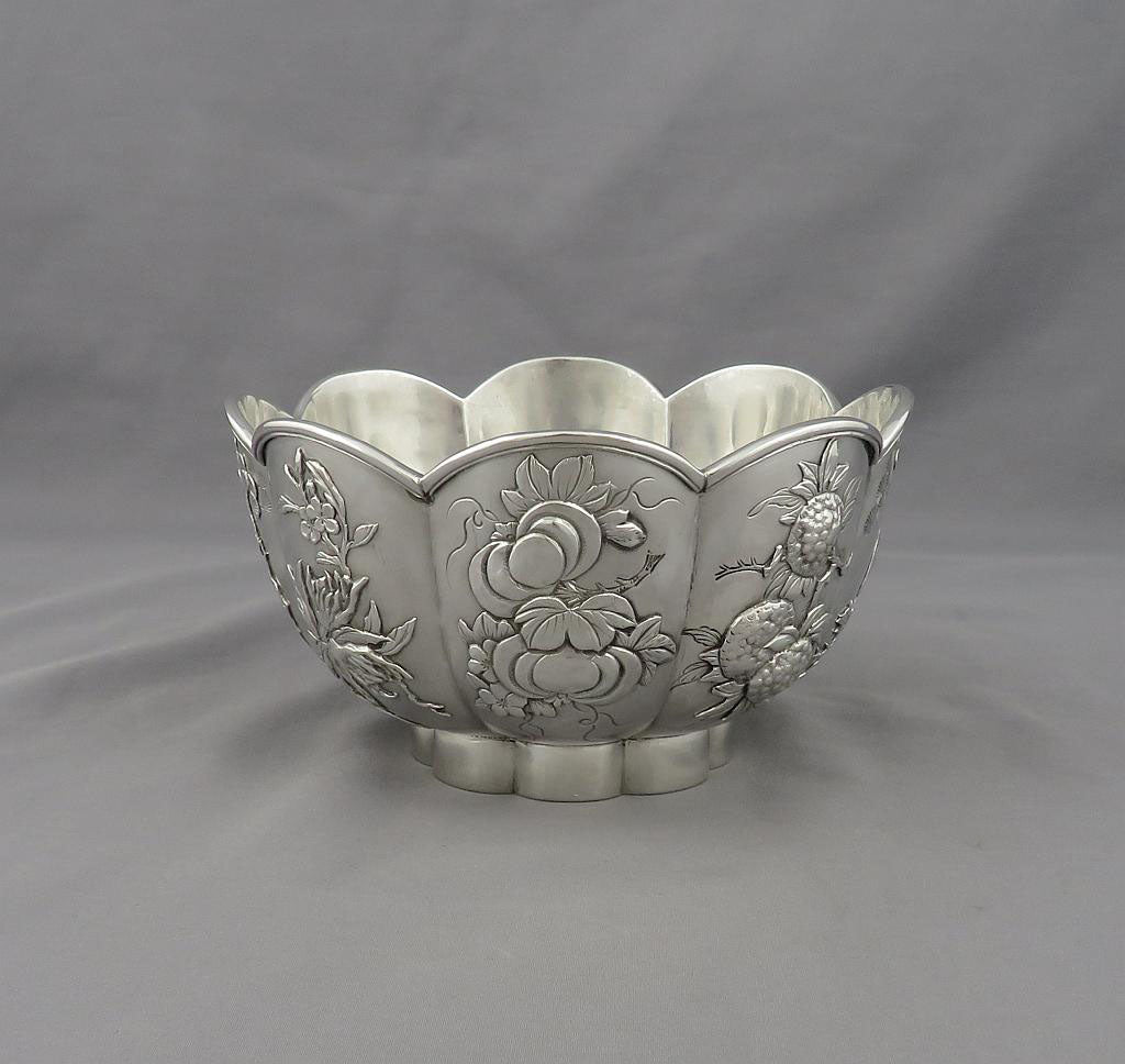 A fine quality Chinese Export Silver bowl by Ye Bo of Canton, probably for Wang Hing*, (Hong Kong and Shanghai) c. 1890. Lobed circular shape on ring foot, with ornate applied decoration depicting birds, peony, pumpkin and chrysanthemum. 5" (12.6cm) diameter, 2.75" (7cm) high, 9 troy oz (279g).