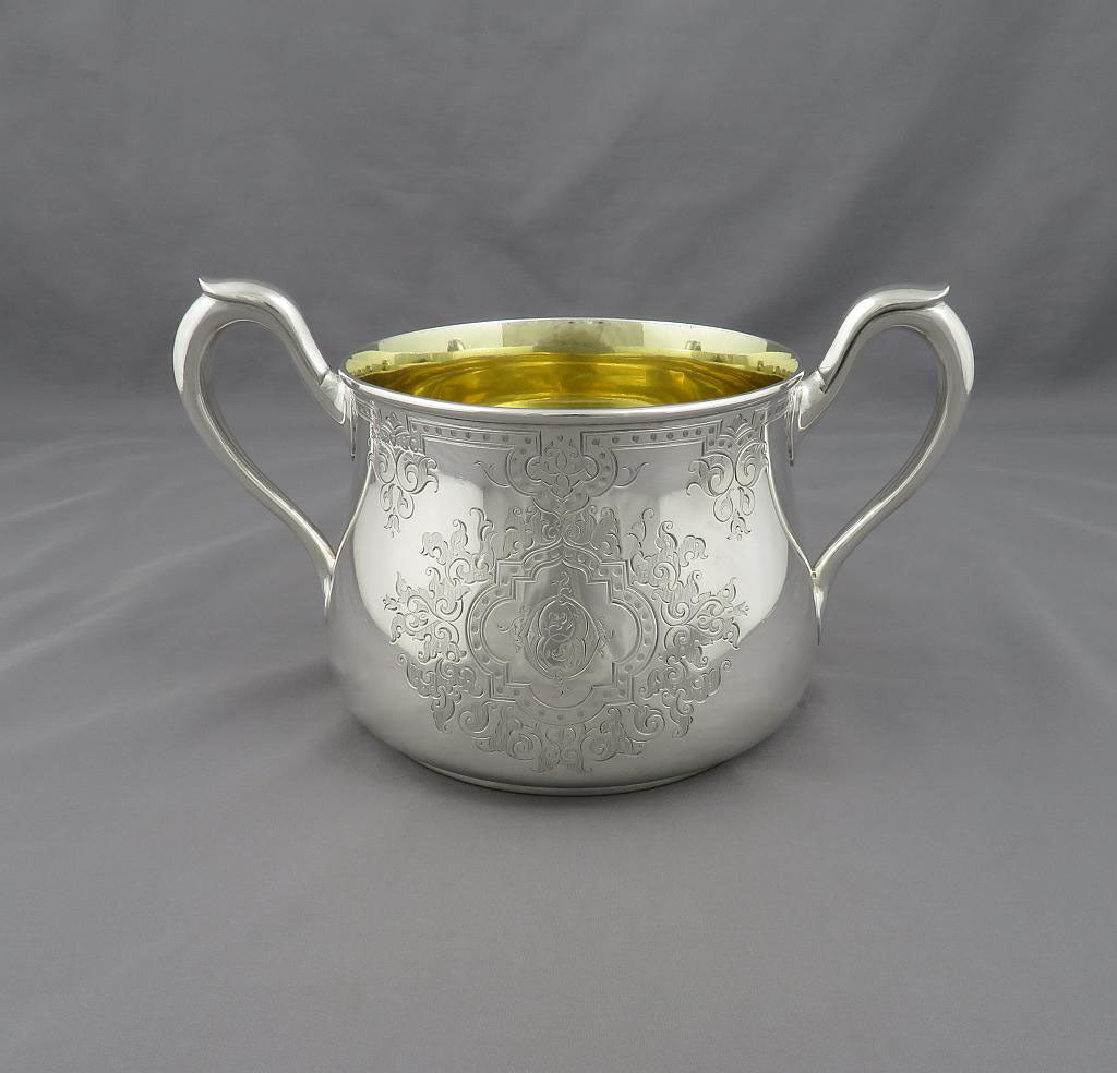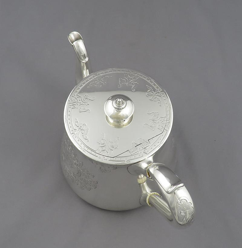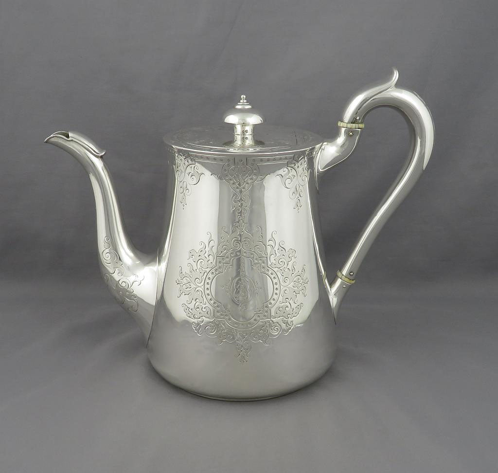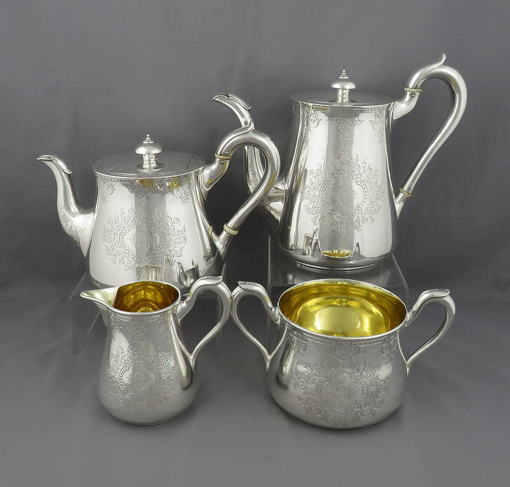 A fine quality Victorian sterling silver tea set by John Samuel Hunt, hallmarked London 1861, with retail mark of Hunt & Ruskell Late Storr & Mortimer. Tapered drum shape with scroll handles and spouts, with engraved decoration in the Regence style. Comprising a teapot, coffee pot, cream jug and sugar bowl. The cream jug and sugar bowl with gilt interiors. Length of teapot handle to spout 8.9" (22.5cm), capacity of teapot 4 cups (1000ml), total weight 67.3 troy oz (2093g)