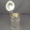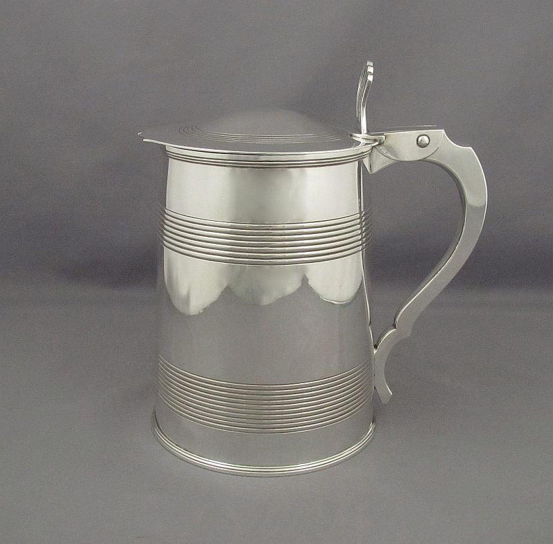 A fine quality and exceptionally heavy George III silver tankard by Henry Nutting (or possibly Hannah Northcote), hallmarked London 1801. Tapered cylindrical shape with domed lid and tau shaped handle, with two parallel bands of threading and "chair-back" thumbpiece. 8 1⁄4" (21cm) high, 42.9 troy oz (1335g).