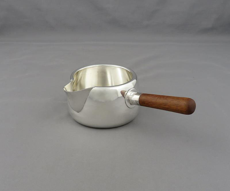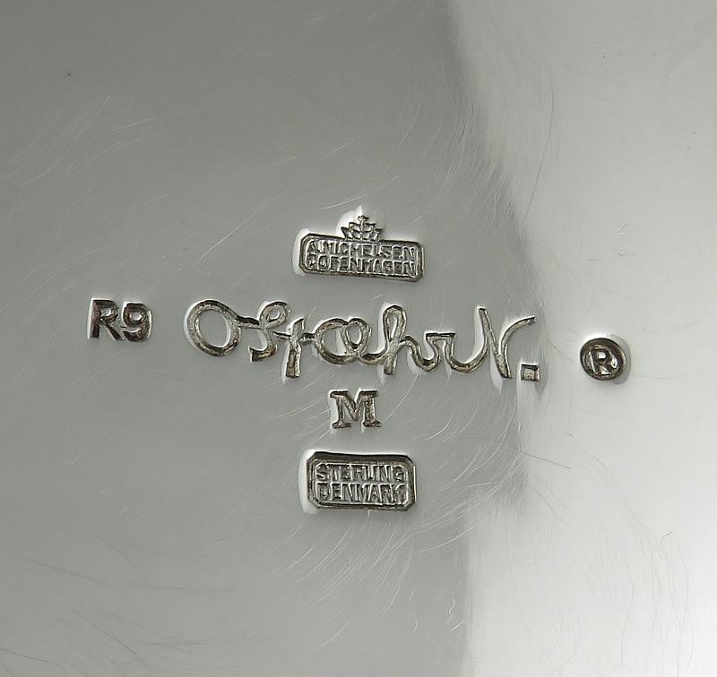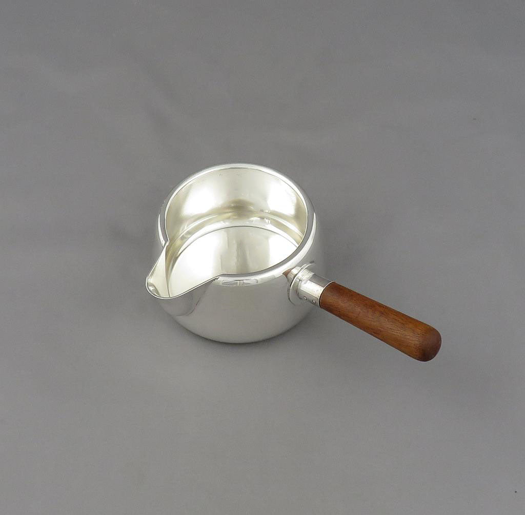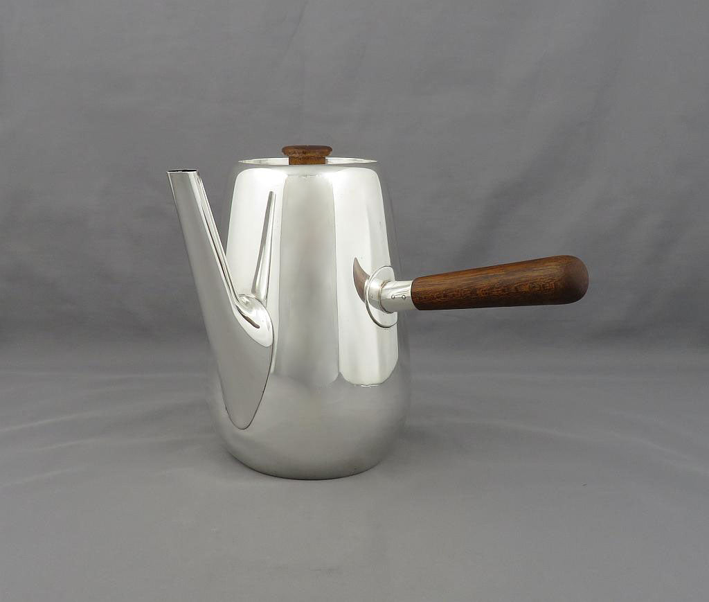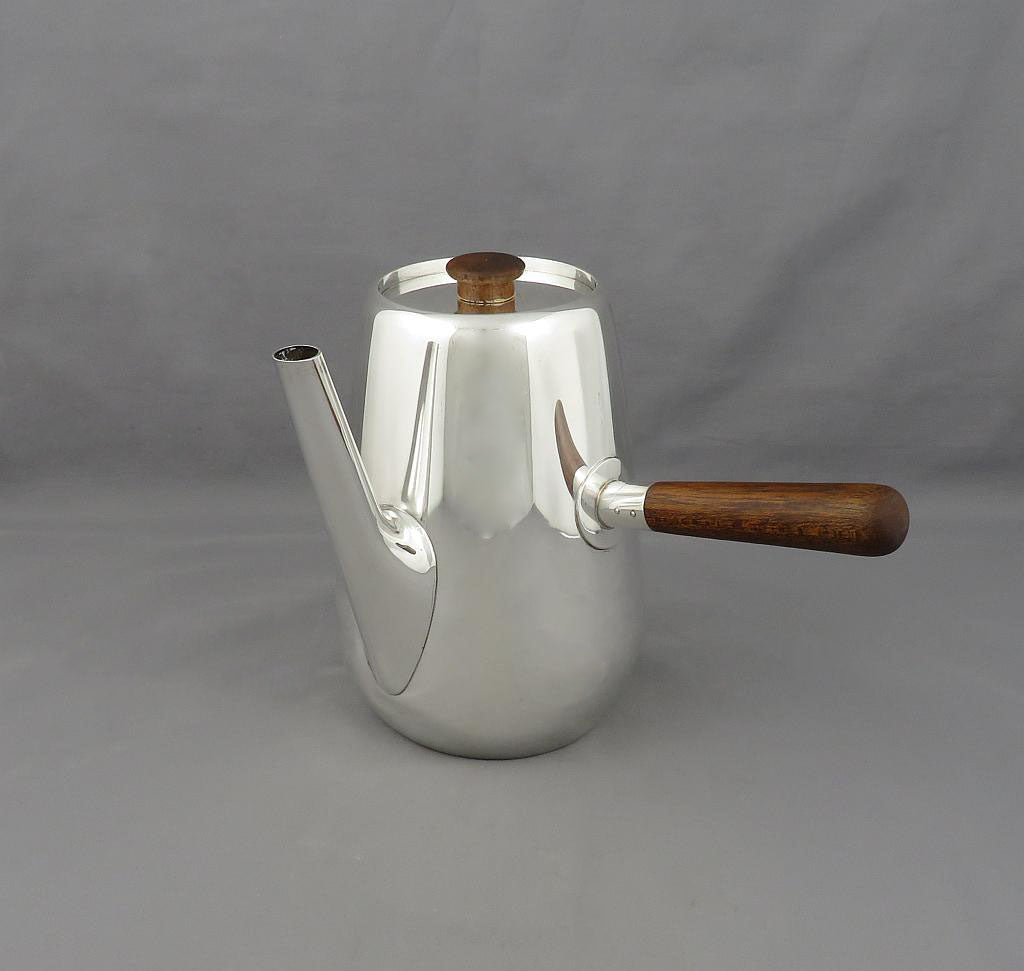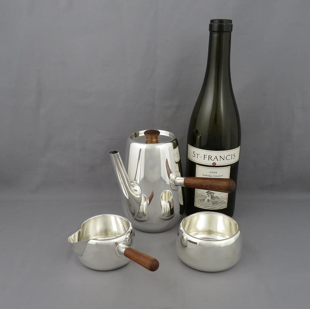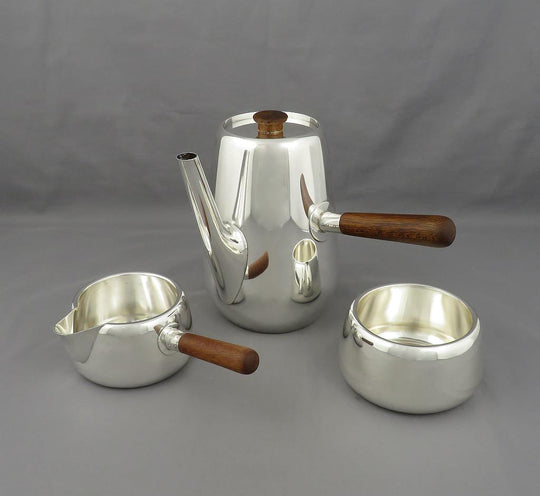A beautiful Danish three-piece sterling silver coffee set by Anton Michelsen, Copenhagen, 1967. Designed by Olaf Stæhr-Nielsen, comprising a coffee pot, milk jug, sugar bowl. Modernist style, the coffee pot is 5.9" (15cm) high, 3 cups (750ml) capacity, total weight is 22 Troy oz (685g).