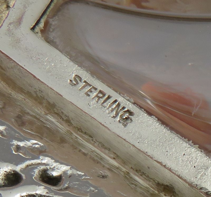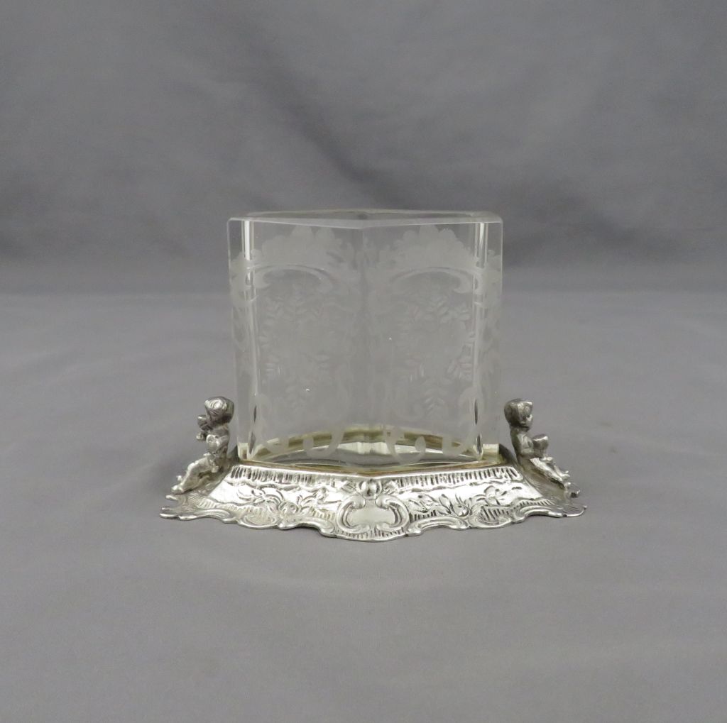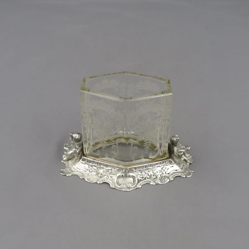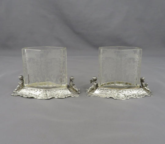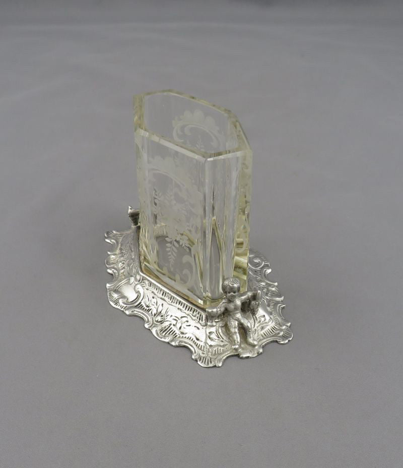 A pair of German silver and etched glass vases c. 1930. Sterling silver base embossed with scrolls and shells, with applied cherub figures. The glass inserts etched with flowers, foliage and scrolls. 2.7" (6.8cm) high, 4" (10.1cm) across.