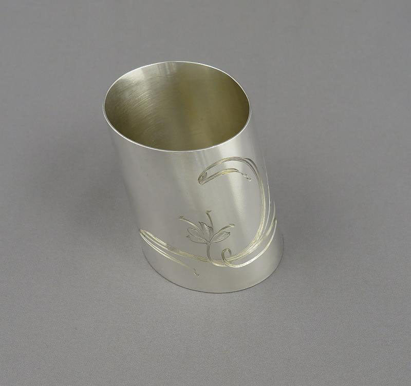 A Russisan silver napkin ring by Nicholai Alexeyev, Moscow, c. 1910. Oblique-shaped body engraved with Art Nouveau decoration. 2" (5cm) wide, 1.3 troy oz (41g).