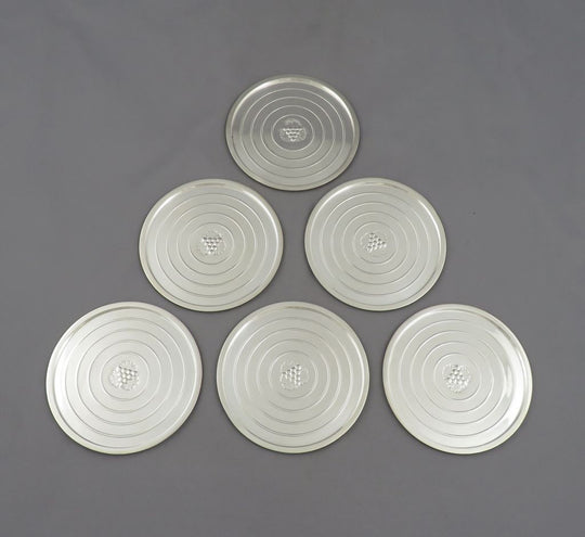 A set of six sterling silver coasters by Georg Jensen, design number 193B, Copenhagen post 1945, designed by Harald Nielsen. 3 3⁄8" (8.6cm) diameter, total weight 6.9 troy oz (215g).