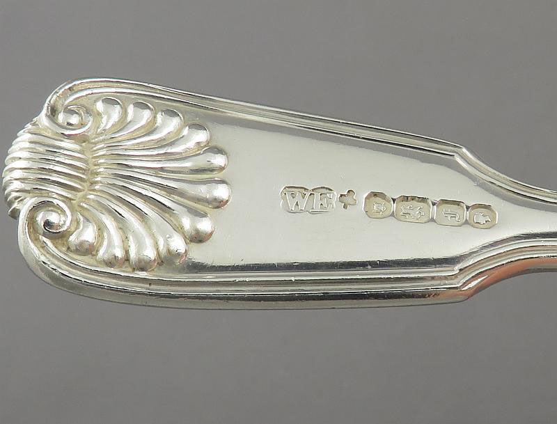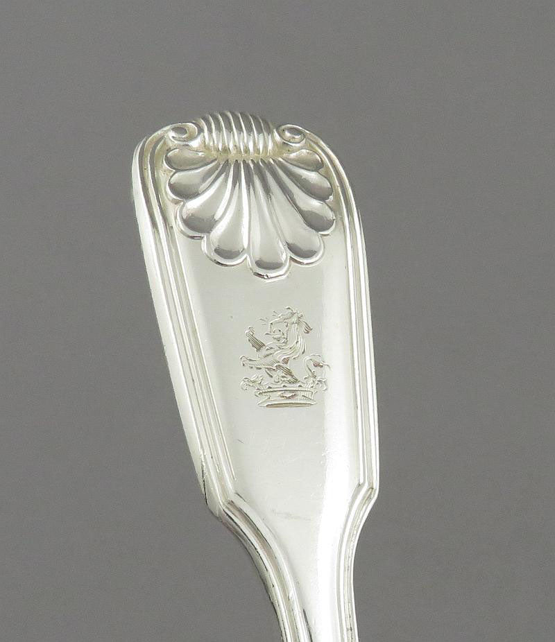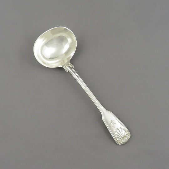 An early Victorian Fiddle Thread and Shell pattern silver gravy ladle by William Eaton, hallmarked London 1841. Double-struck, engraved with a Engraved with a family crest on the terminal. 7.1" (18cm) long, 3.2 troy ounces (99g).