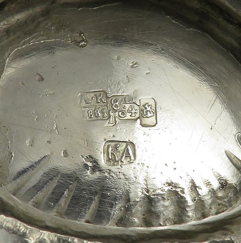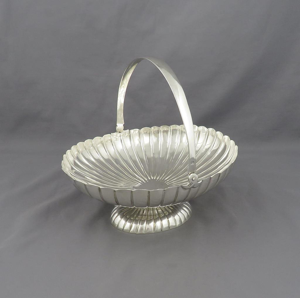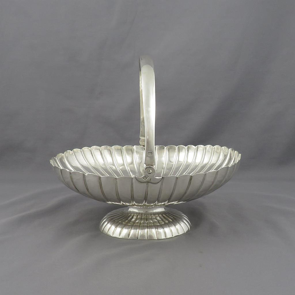 A Russian silver basket by Karl Antrityev, assayed by unknown A K, Mocow 1881. Fluted oval shaped body on conforming pedestal foot with swing handle. 7.25" (18.4cm) across, 6.3 ozt (195g).