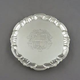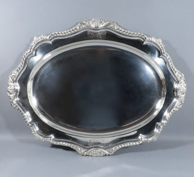 You will find a fine selection of antique silver trays, tea trays, platters and antique silver salvers at JH Tee Antiques. To purchase one of our antique silver trays please click on the Add to Cart button, the Email Inquiry button or visit our shop in Vancouver. Please click on an image of an antique silver serving tray to see a larger picture and more information. There are a number of different types of trays commonly found in silver. Silver salvers are typically round although they can also be oval, square or occasionally rectangular. Antique silver salvers come in many sizes, they do not have handles but they always have feet. Smaller silver salvers are often called waiters.