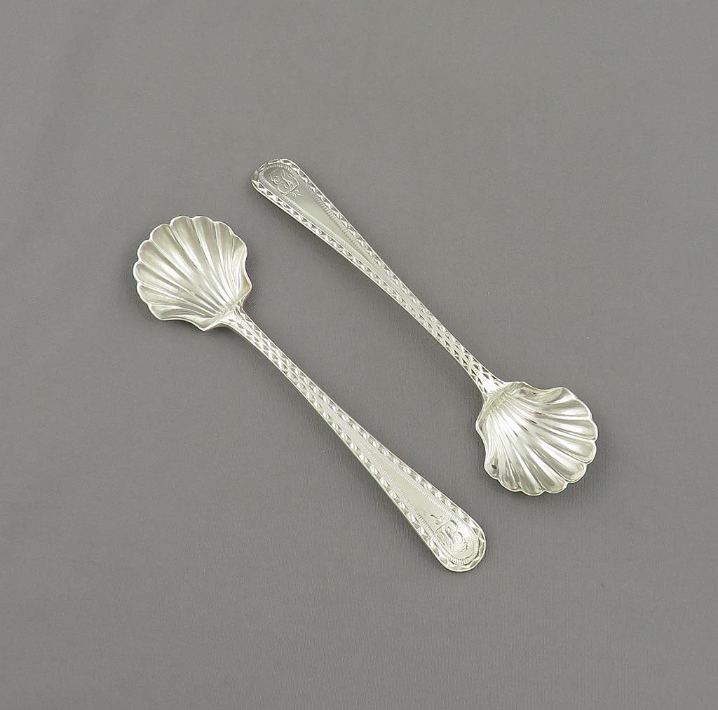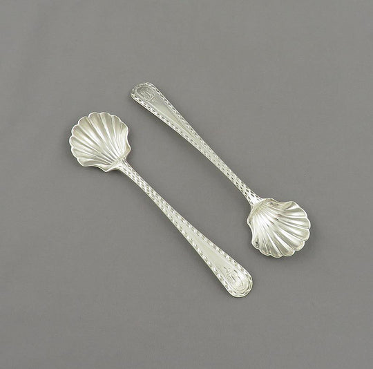 A fine pair of George III silver salt spoons by Stephen Adams I, London c. 1790. Old English feather-edge Pattern, with scallop shell bowl and monogrammed EL on the terminal. 4" (10cm) long.