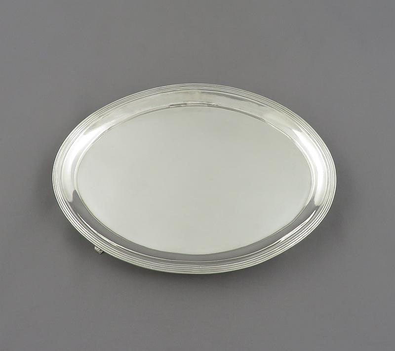 A George III sterling silver teapot by Robert Hennell I & David Hennell II, hallmarked London 1795, with matched teapot stand by Peter, Ann & William Bateman, hallmarked London 1799. Plain oval shaped body on the conforming stand, with redeed border and wooden handle. Height of tea pot 6.5" (16.6cm), capacity of teapot 3.5 cups (875ml), total weight 18.8 troy oz (585g).