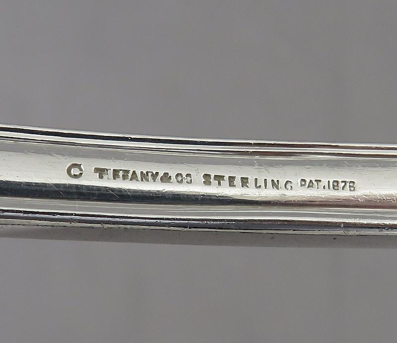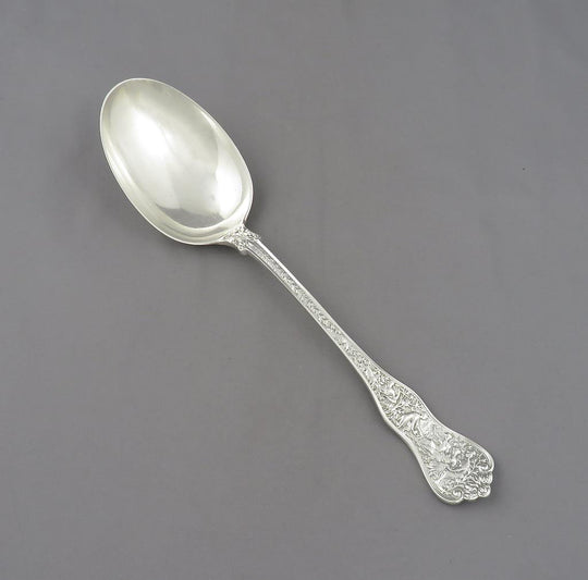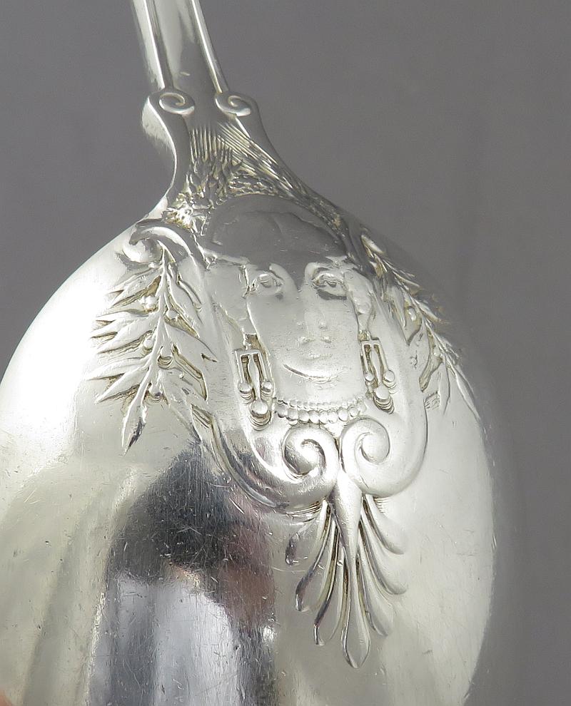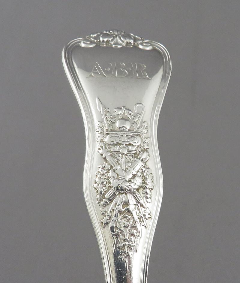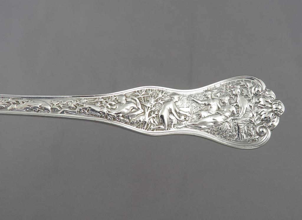 A fine quality sterling silver serving spoon in Olympian pattern by Tiffany & Co., New York, c. 1902-1907. The handle die-struck with a detailed scene from Greek mythology. Monogrammed A.B.R. on the reverse. 9 5/8" (24.5cm) long, 4.8 troy oz (148g).