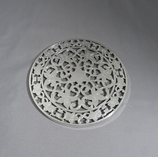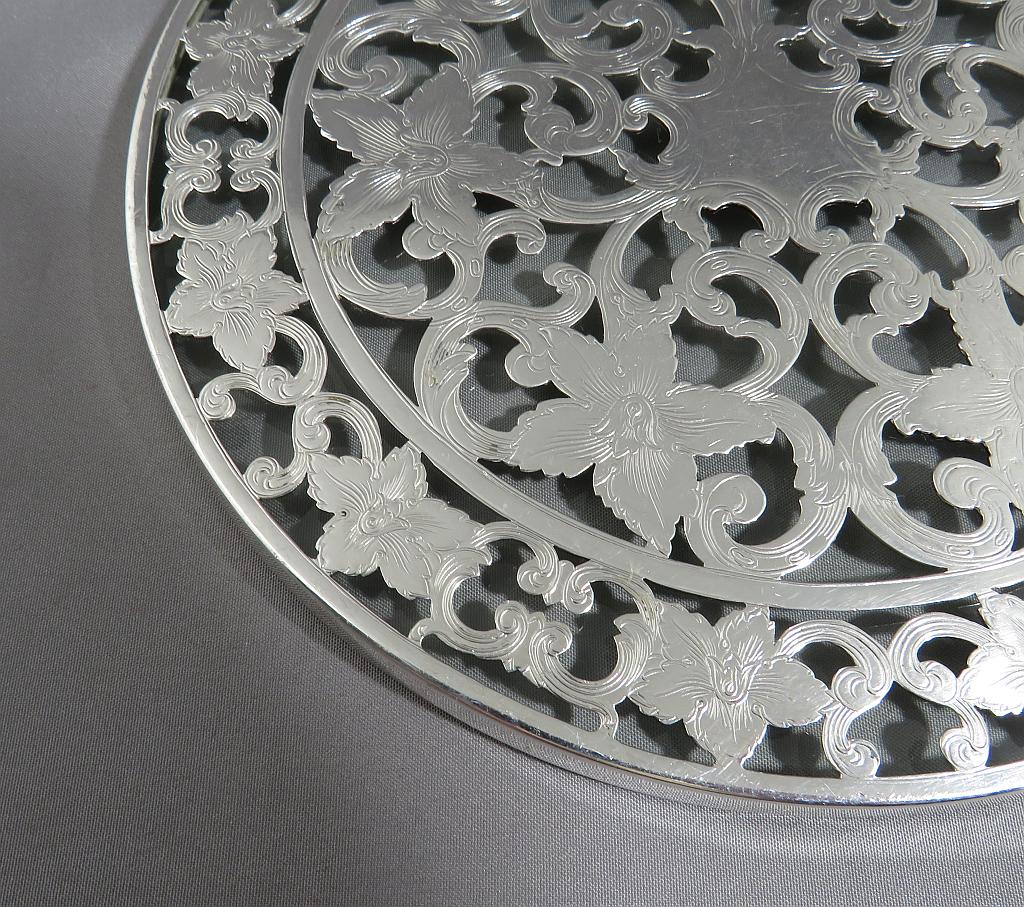 An American sterling silver overlay trivet by Webster Sterling, North Attleboro, MA c. 1950. In the Lily Art Nouveau pattern, the glass trivet with ornate sterling silver scroll and foliage decoration. 6" (15.3cm) diameter.