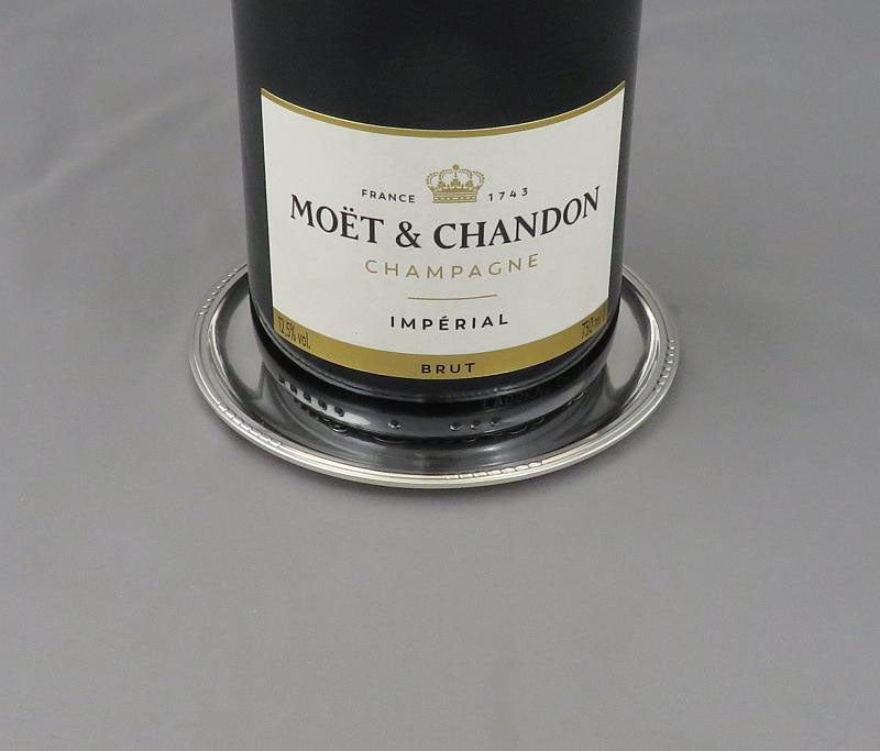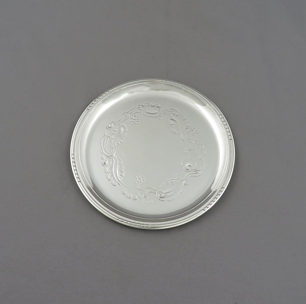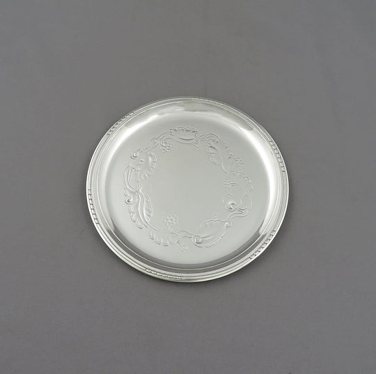A sterling silver coaster by Georg Jensen, model #51D, Copenhagen c. 1945-51. Circular shaped body, chased with floral and foliage decoration. 4.6" (11.7cm) diameter, 2.8 troy oz (86g).
