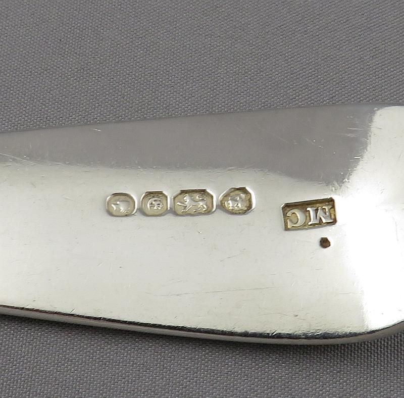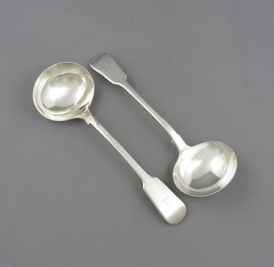 A pair of early Victorian sterling silver Fiddle pattern gravy ladles by Mary Chawner, hallmarked London 1840. Engraved with a family crest on the terminal. 7.25" (18.4cm) long, 4.9 troy oz (154g).