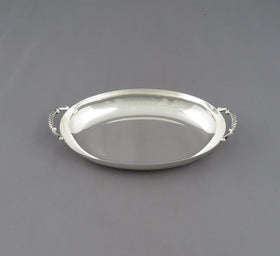 You will find a fine selection of antique silver trays, tea trays, platters and antique silver salvers at JH Tee Antiques. To purchase one of our antique silver trays please click on the Add to Cart button, the Email Inquiry button or visit our shop in Vancouver. Please click on an image of an antique silver serving tray to see a larger picture and more information. There are a number of different types of trays commonly found in silver. Silver salvers are typically round although they can also be oval, square or occasionally rectangular. Antique silver salvers come in many sizes, they do not have handles but they always have feet. Smaller silver salvers are often called waiters.