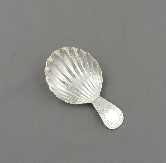 A George III silver tea caddy spoon by Thomas Wallis II, hallmarked London 1789. Neoclassical style with scallop shell bowl, engraved with bright-cut decoration on the handle. 2.7" (6.8cm) long.